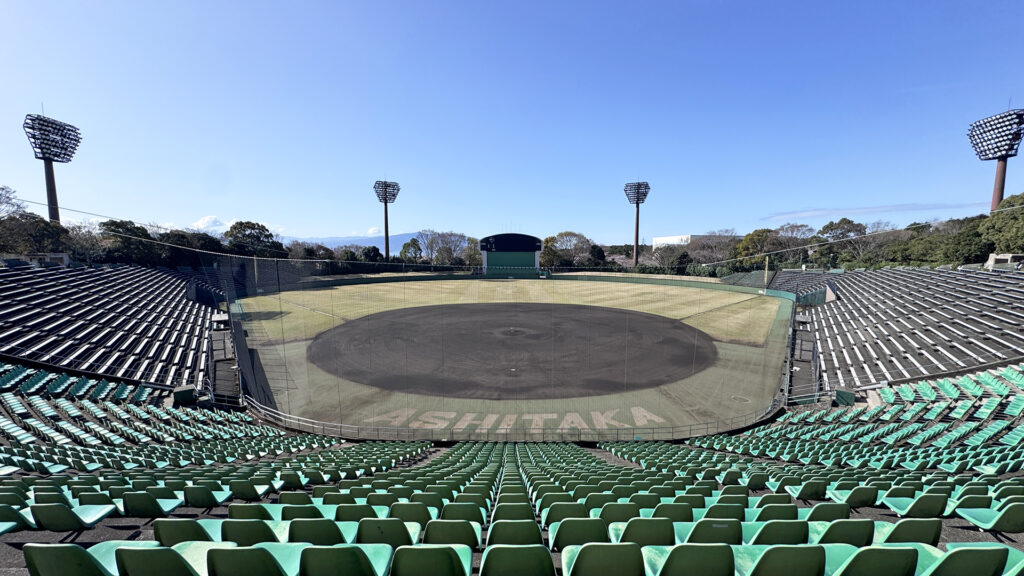 愛鷹広域公園内にある野球場です。好天の日には、外野後方に駿河湾を望む風光明媚な野球場となっています。